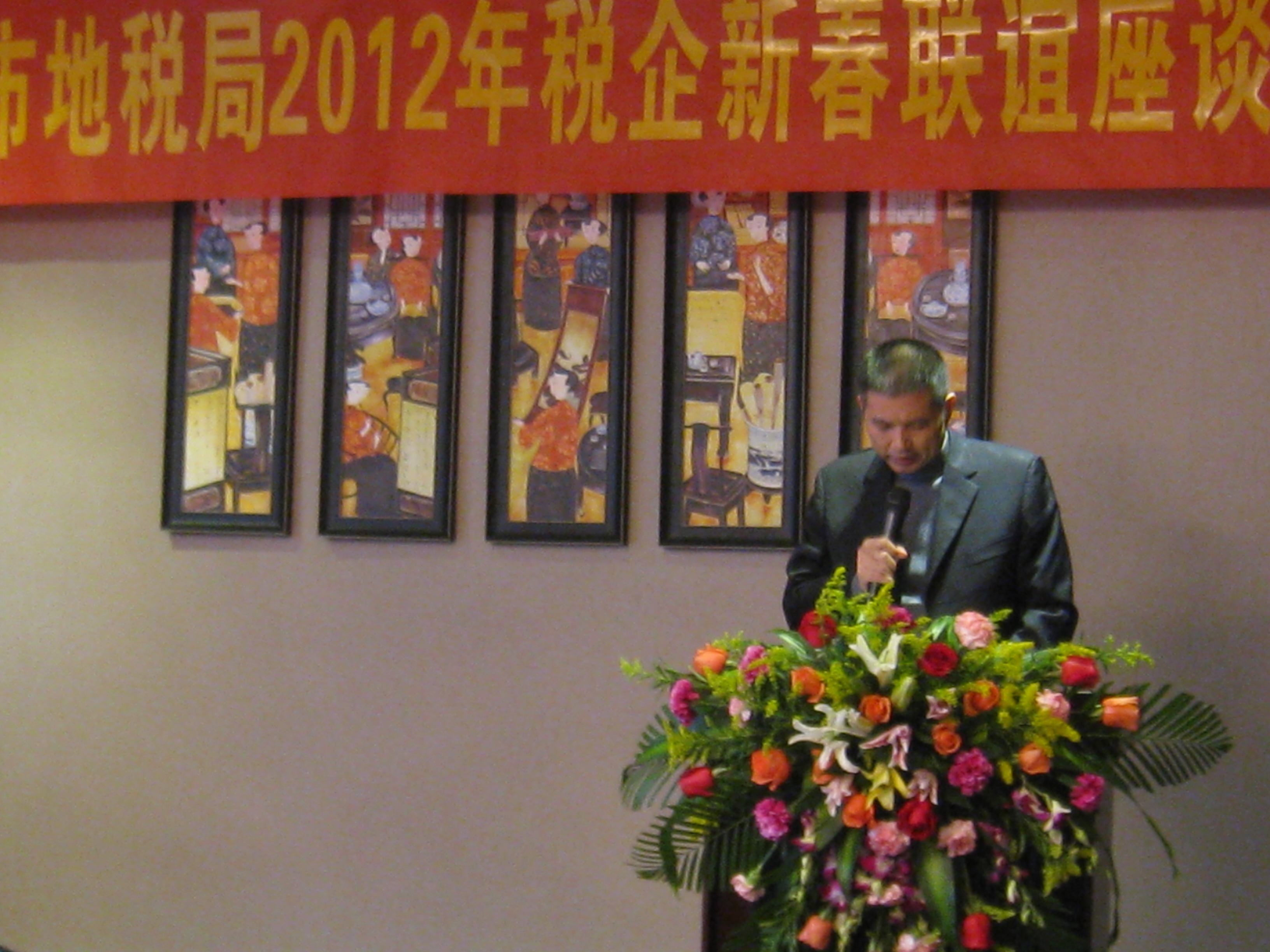 今天,我们海口市企业联合会、海口市企业家协会和海口市地方税务局在此共同举办2012年海口税企新春联谊座谈会,其目的就是为进一步密切税企间关系,促进税企间的沟通与交流,构建税企和谐,更好推进海口经济的发展。希望海口的企业依法经营,强化管理,依法纳税;同时也希望我市税务部门依法征收,服务企业,让企业享受国家给予企业税赋方面的优惠政策;希望今天来参加座谈会的各位企业家、企业代表本着为海口经济发展,本着为共建税企和谐,本着为自身企业发展等目标,大家各抒己见,畅所欲言,建言献策。让我们共同努力为推动全市经济社会又好又快发展、为把海口建设成为最精、最美的省会城市作出新的更大贡献。祝愿本次海口税企新春联谊座谈会开得圆满成功!