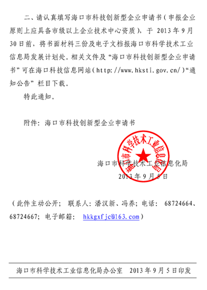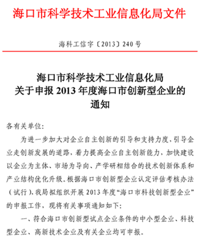 关于申报2013年度海口市创新型企业的通知