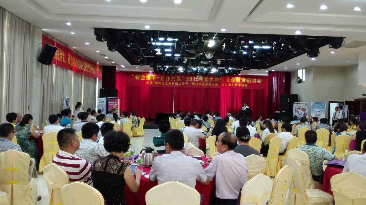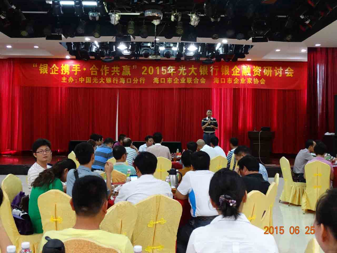 6月25日,由海口市企业联合会、海口市企业家协会和中国光大银行主办的银企研讨会在海口召开。会上,光大银行和企业家们围绕如何为企业解决融资问题做了广泛深入的讨论。光大银行还就小额融易贷、抵押融易贷,活期宝、BTA理财,白领贷、POS贷、助业贷款、汽车消费贷款、综合消费贷款等金融服务套餐向企业家们做了介绍和答疑。会上,海南万物集团有限公司等九家企业分别与中国光大银行进行了融资协议签约,签约金额达3.06亿元。市工商联主席、市企业家协会会长叶茂,本会副会长、中国光大银行海口分行风险总监李守靖,常务副会长兼秘书长羊孟元,常务副会长周财吉,副会长阮欣、苏文和、韩友宁、任小明、龚益国、谢杨、王孙文、黄洪卢、梁小喜、赵诚等协会领导和来自我市各行业的130多家企业负责人参加研讨会。
