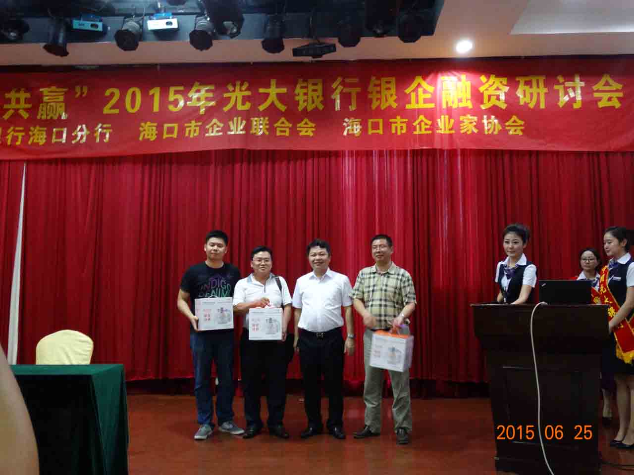 中国光大银行海口分行李守靖副行长(右二)为中奖会员颁发奖品 |