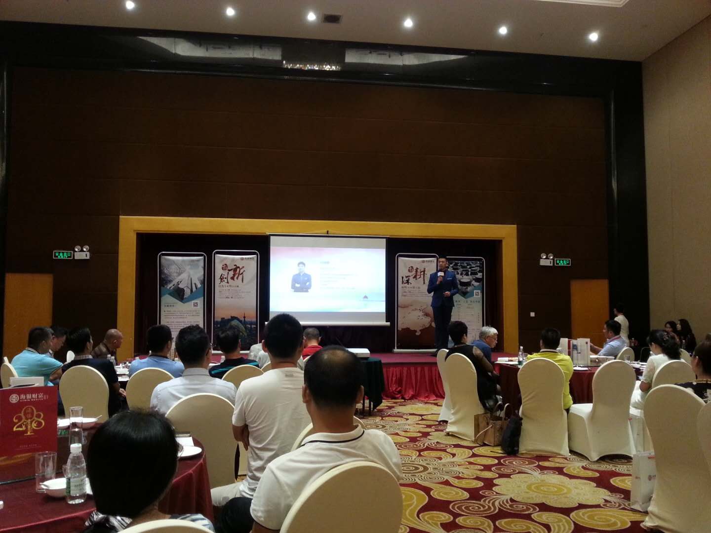 8月24日,我会和海银财富管理有限公司海口分公司联办“走进海银、睿享财富”沙龙会在国贸文华路海南君华海逸酒店举行。会长叶茂、执行会长兼秘书长羊孟元、执行会长周财吉、副会长张玉军、谢杨、韩友宁、李江涛等协会领导、海银财富有限公司助理副总裁马守斌和来自会员企业负责人近四十人参加了活动。 会长叶茂代表协会致辞。海银财富有限公司助理副总裁马守斌作讲话。海银财富管理有限公司高级IC经理付成鑫先生就如何把握我们的财富,实现财富增值,如何通过家族信托进行财富传承等理财知识和与会企业家们进行了精彩分享。最后,来自贵酿酒业的生产厂家的负责人为我们分享健康饮酒知识,让各位带着轻松,带着愉悦,开启晚宴交流。