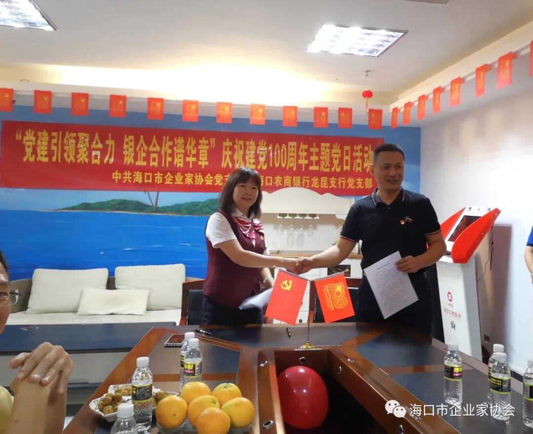 7月2日,海口市企业家协会党支部与海口农商银行龙昆支行联合开展“党建引领聚合力,银企合作谱华章”庆祝建党100周年主题党日活动。海口市企业家协会、企业联合会执行会长兼秘书长羊孟元,海口市企业家协会党支部书记毛国新,海口农商银行副行长万一览,海口农商银行龙昆支行党支部书记、行长邓超凡,海口市企业家协会党支部全体党员及海口农商银行龙昆支行全体党员共16人参加了活动。