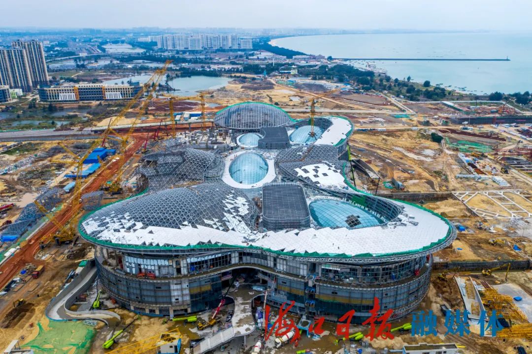当天上午,已安装上玻璃的地块五免税商业中心屋面穹顶格外通透明亮,曲线灵动飘逸。据了解,造型屋面由5块穹顶、2个冷却塔、绿植墙和外围单双层网壳组成。