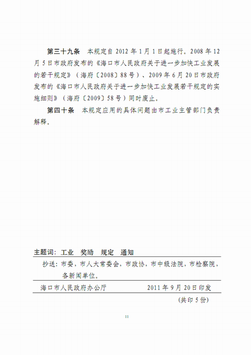 海口市人民政府关于加快工业发展的若干规定(海府〔2011〕105 号)
