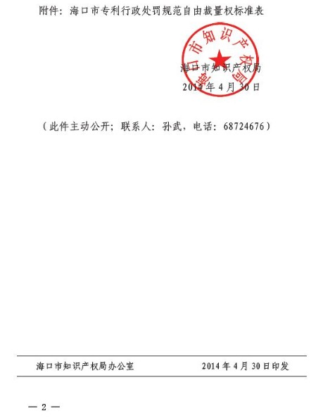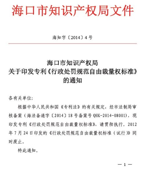 关于印发专利《行政处罚规范自由裁量权标准》的通知