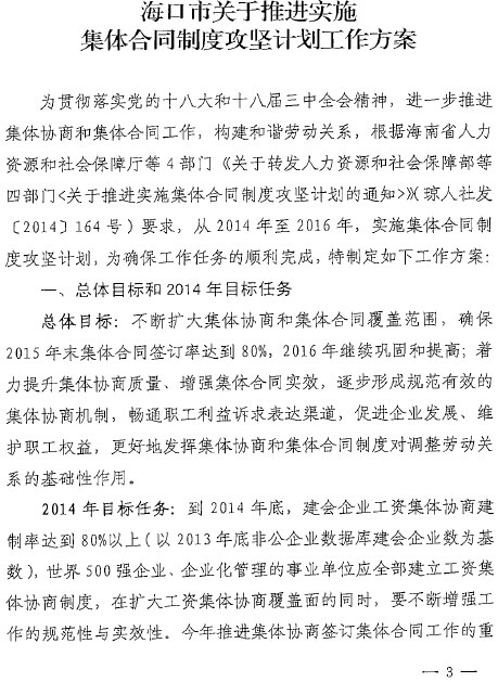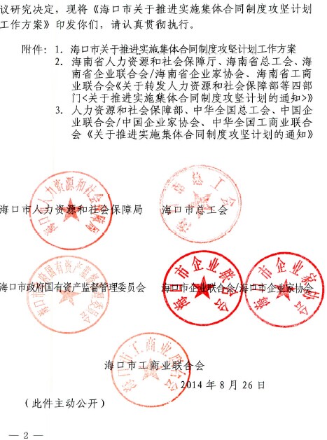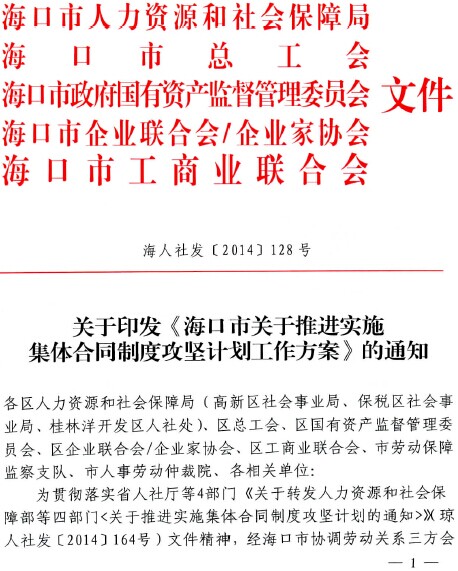 关于印发《海口市关于推进实施集体合同制度攻坚计划工作方案》的通知