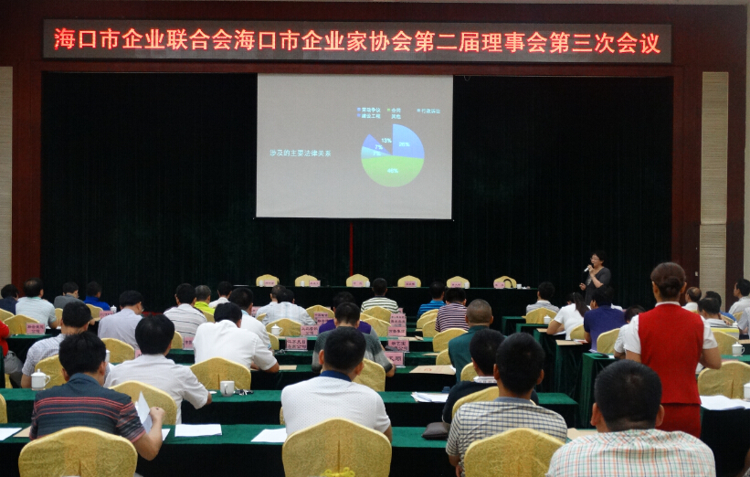 5月21日,海口市企业联合会海口市企业家协会第二届理事会第三次会议召开。市委常委、统战部长王云霞,市统战部副部长唐火根,市工商联主席、本会会长、海南金鹿集团投资有限公司董事长叶茂。常务副会长兼秘书长羊孟元,本会法律顾问兼副会长姜丹,副会长邓宇泽、周财吉、尹磊、赵波、李传明、赵诚、王孙文、李守靖、许振发、朱旭航、张玉军、王定和、刘汉惜、徐磊、阮欣、李正勇、黄德、陈祥颜、任小明、龚益国和理事代表一百多人参加会议。会议由副会长邓宇泽主持。 会上,常务副会长兼秘书长羊孟元代表第二届理事会做了《2014年度工作报告和2015年工作计划报告》,副会长邓宇泽做了《2014年度理事会财务报告》和《第二届理事会人事变动报告》。 会议补选了邓宇泽、周财吉为海口市企业联合会海口市企业家协会常务副会长,补选了尹磊等11名企业家为副会长。 市统战部副部长唐火根、会长叶茂为补选的常务副会长以及副会长颁发了《证书》。本会法律顾问、副会长海南嘉天律师事务所主任姜丹为企业家们做了法律知识讲座。 选举结束后,叶会长致辞。叶会长对出席会议的领导、理事单位表示热烈欢迎和衷心的感谢,对新当选的常务副会长、会长表示热烈的祝贺!对常务副会长兼秘书长羊孟元做的工作报告给予了肯定,对秘书长2014年的工作表示认可,并对2015年的工作提出了意见。叶会长指出今后的工作需要改革创新、拓展思维,希望秘书处的工作能更好地服务企业家、服务社会,进一步提高海口市企联的知名度。 市委常委、统战部长王云霞做了重要讲话。王常委对协会第二届理事会第三次会议的召开表示祝贺!对协会的工作表示认可,也祝愿协会能够越办越好,希望企业家们利用协会这个平台,充分施展自己的才华把海口建设得更好。会上,王云霞还传达了省委常委、市委书记孙新阳在给全市副处级以上领导干部讲“三严三实”专题党课精神,介绍了在全市开展“三严三实”的实践活动情况。 各位企业家们为王云霞常委在百忙之中出席会议并重要讲话表示十分感谢!表示深刻感受到了市委、市政府领导对协会工作的认可和支持,对孙新阳书记、倪强市长的务实作风和亲民作风深受鼓舞,对市委、市政府加强和改进我市党风廉政建设表示全力支持,对海口投资环境不断的改善有信心,对在海口投资发展有信心。