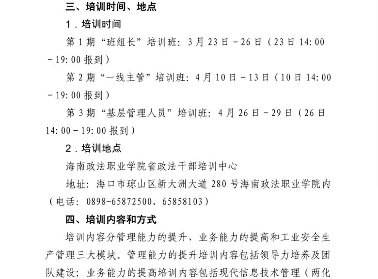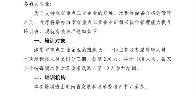 海南省工业和信息化厅关于举办海南省重点工业企业班组长岗位管理能力提升培训班的通知