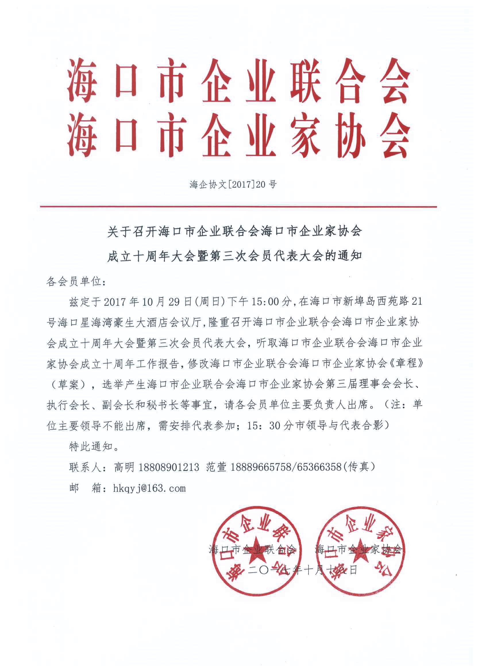 关于召开海口市企业联合会海口市企业家协会成立十周年大会暨第三次会员代表大会的通知