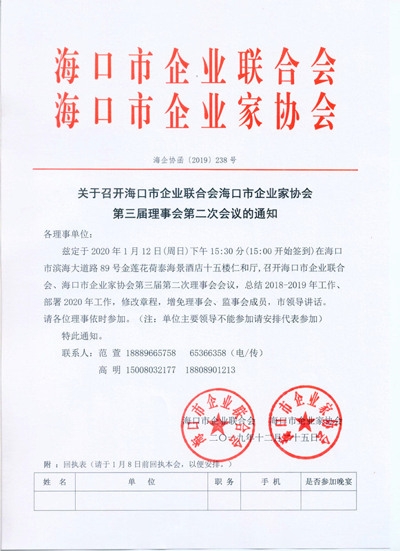 关于召开海口市企业联合会海口市企业家协会第三届理事会第二次会议的通知