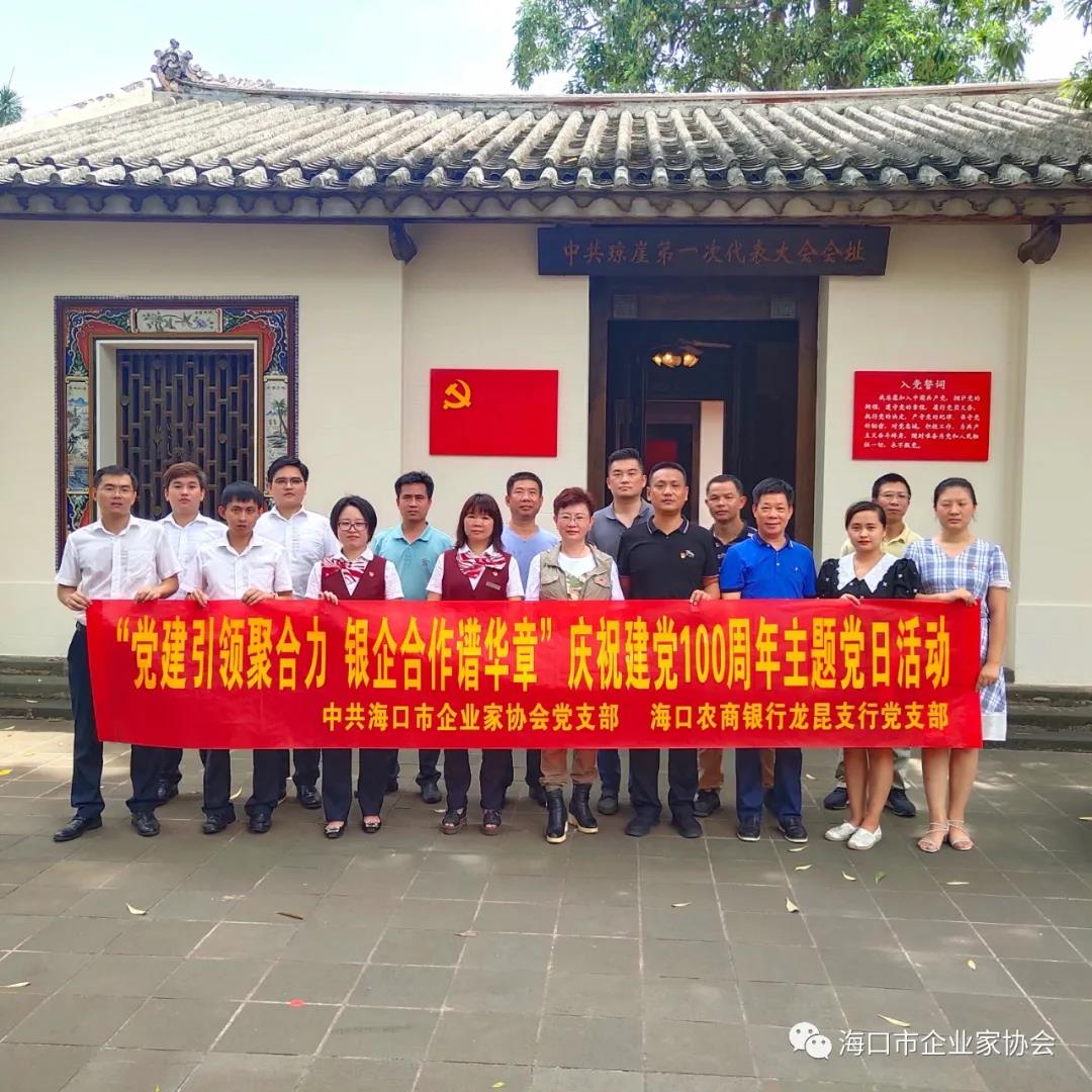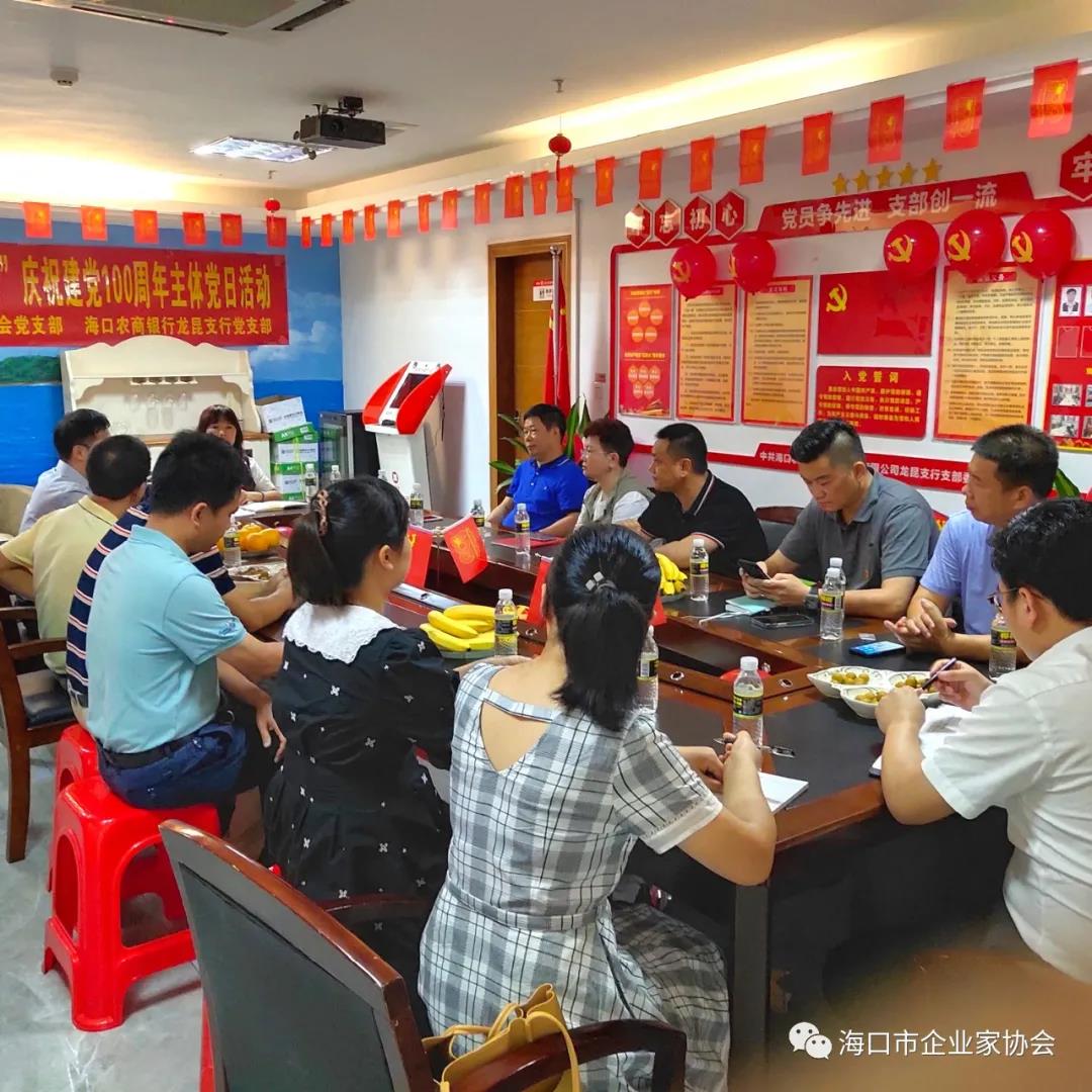 7月2日,海口市企业家协会党支部与海口农商银行龙昆支行联合开展“党建引领聚合力,银企合作谱华章”庆祝建党100周年主题党日活动。海口市企业家协会、企业联合会执行会长兼秘书长羊孟元,海口市企业家协会党支部书记毛国新,海口农商银行副行长万一览,海口农商银行龙昆支行党支部书记、行长邓超凡,海口市企业家协会党支部全体党员及海口农商银行龙昆支行全体党员共16人参加了活动。