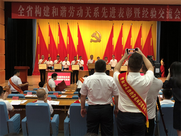 10月8日,海南省构建和谐劳动关系先进表彰暨经验交流会在省政协礼堂召开。省委副书记、政法委书记沈丹阳出席会议并讲话,省政府副省长顾刚主持会议。会上,省人力资源社会保障保障厅长李锋宣读关于海南省和谐劳动关系创建示范企业、工业园区命名决定。