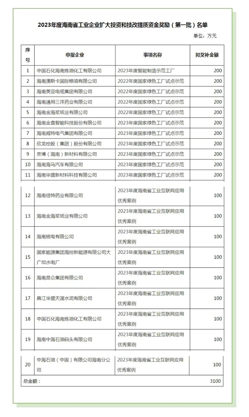 按照《海南省支持工业企业扩大投资和技改提质奖补资金管理实施细则》《关于组织申报2023年度海南省工业企业扩大投资和技改提质奖补资金的通知》的有关程序,我省拟对中国石化海南炼油化工有限公司等获得国家和省级工业互联网试点示范,国家智能制造、服务型制造、绿色工厂等试点示范的18家企业的20个项目开展第一批资金奖励。拟奖补金额100万元至200万元不等,公示期自2024年4月22日至4月28日。
